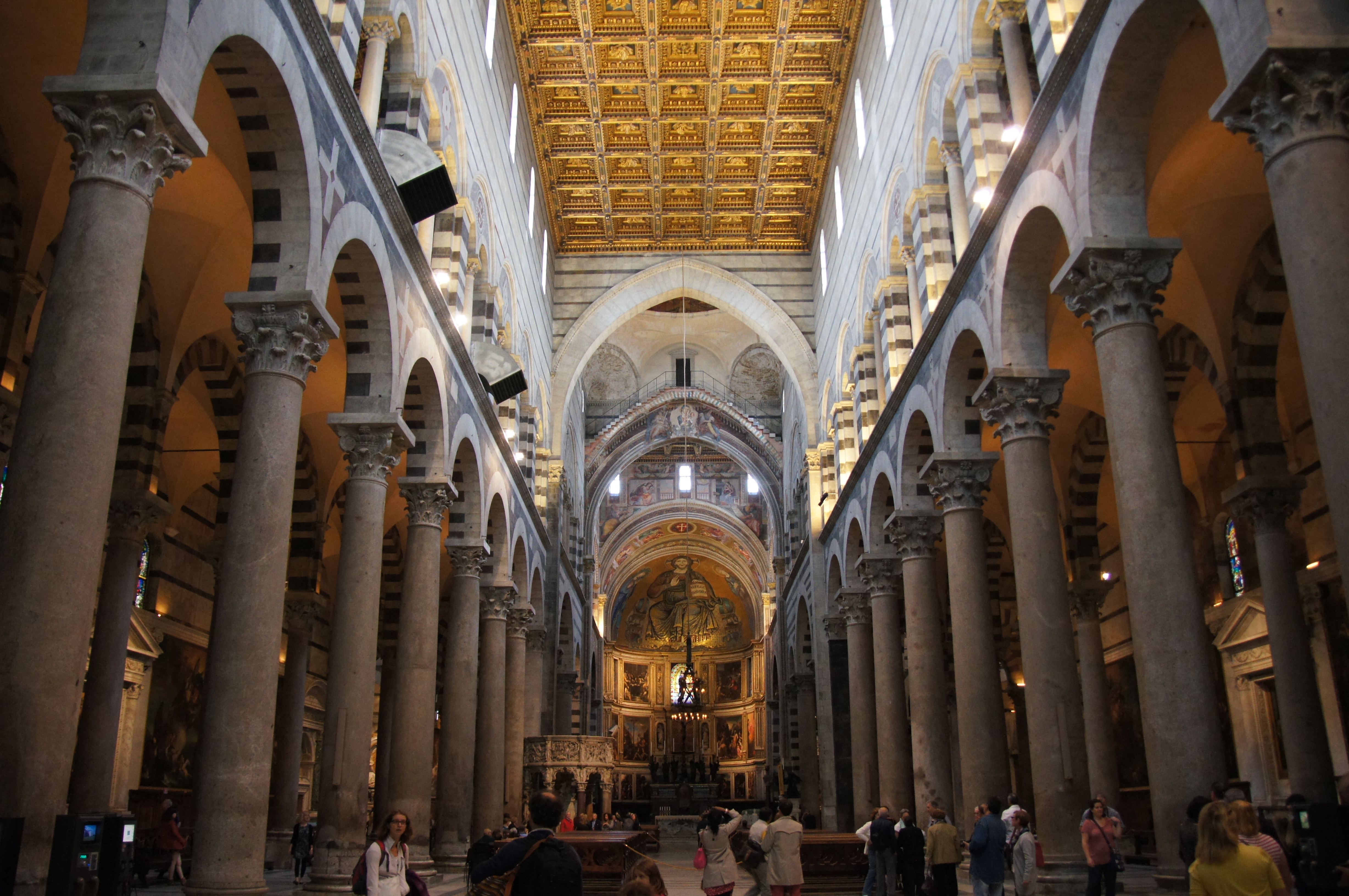 Solemn and luminous, the interior is characterised by its imposing granite pillars with sculpted capitals in Corinthian style and by its lively two-coloured marble facing, with black and white bands of marble, repeating the external decorations of the outer façade, adding colour to the undulating motif of the arcades along the nave and the women's gallery. An extremely rich wealth of works of art is to be found througout the interior which is rendered event more majestic by the beautiful marble floor, its cross vault including a large section of the original cosmatesque decoration, and by the sumtuous coffered ceiling, that was rebuilt after the 1595 fire by the Florence-based Atticciati work-shop. The display of masterpieces begins [...] on the counter-façade where, to the side of the main door, underneath a balcony also known as “Poggiolo delle reliqui”, can be found the funeral monuments of the archbishops Francesco Frosini, Matteo Rinuccini, Giuliana de' Medici and Francesco Guidi, all works of considerable importance by 17th- and 18th-century sculptors. In 1523, the sculptural features of the Cathedral, further damaged by the 1595 fire, underwent wide internal refurbishments that continued over the following centuries. Continuing down the lateral aisles, the two arms of the transpect and the smaller aisles at the sides of the choir-stalls, there follows a succession of marble altars, nine of which were sculpted in the 16th century by the Versilian-born artist Stagio Stagi. [...] Equally rich is the wealth of paintings and mosaics decorating the Cathedral, whose oldest surviving evidence, which is still in place, is the small 13th-century painting on a wooden tablet known as Madonna di sotto gli organi, on the altar of the same name. The oldest fresco, a large Virgin with Child, that was brought to light in 1958 at the top of the triumphal arch, attributed to Maestro di San Torpé, dates back to somewhere between the late 13th century and the early 14th century. [...] Of much greater importance is the wonderful mosaic work in the apse, with Cristo in maestrà tra la Madonna e San Giovanni Evangelista, the only documented work by Cimabue, who created the figure of Saint John. [...] A wide cycle of paintings on wood and canvas winds along the walls of the two aisles and the apsidal tribune, providing a summa of Tuscan-Roman pointing between the late Renaissance and the first signs of neoclassicism. Amongst these stand out masterpieces by Andrea Del Sarto and Domenico Beccafumy [...]. Finally, dense with reminiscences of the more ostentatious Roman baroque style is the bright, dazzling Assumption of the Virgin and Saints, frescoed in the cupola, in the form of th evault of heaven, by Orazio and Girolamo Rimialdi [...].